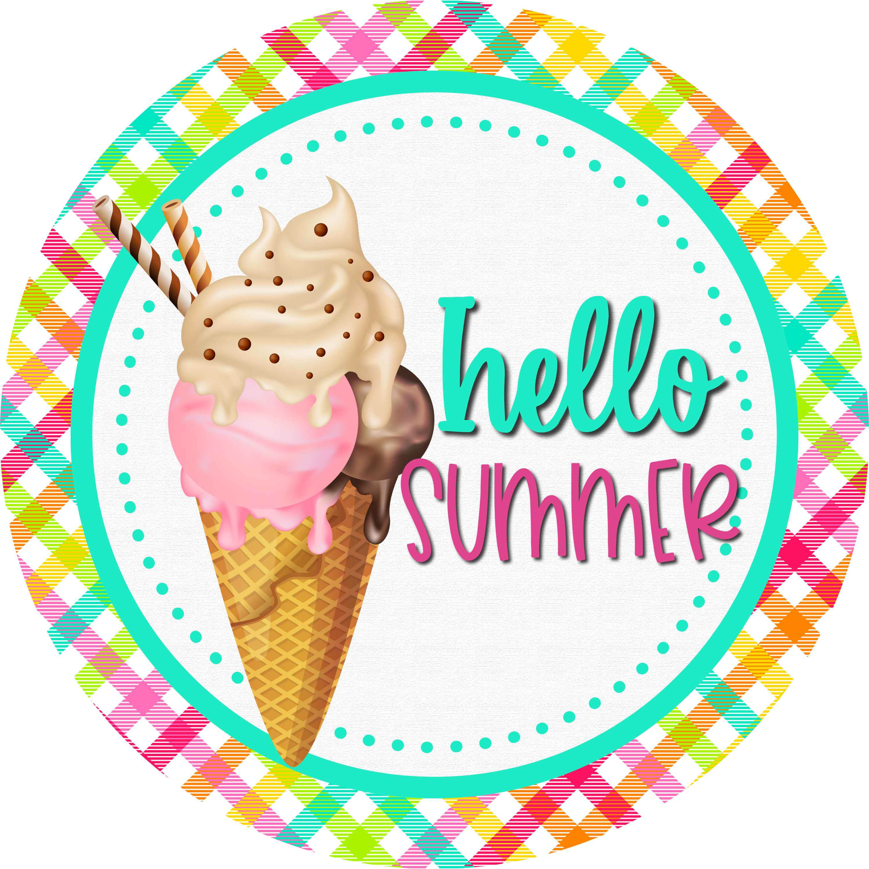 Letrero de helado "Hola Verano", letrero metálico sublimado con cuadros coloridos, corona de verano, decoración para puerta.