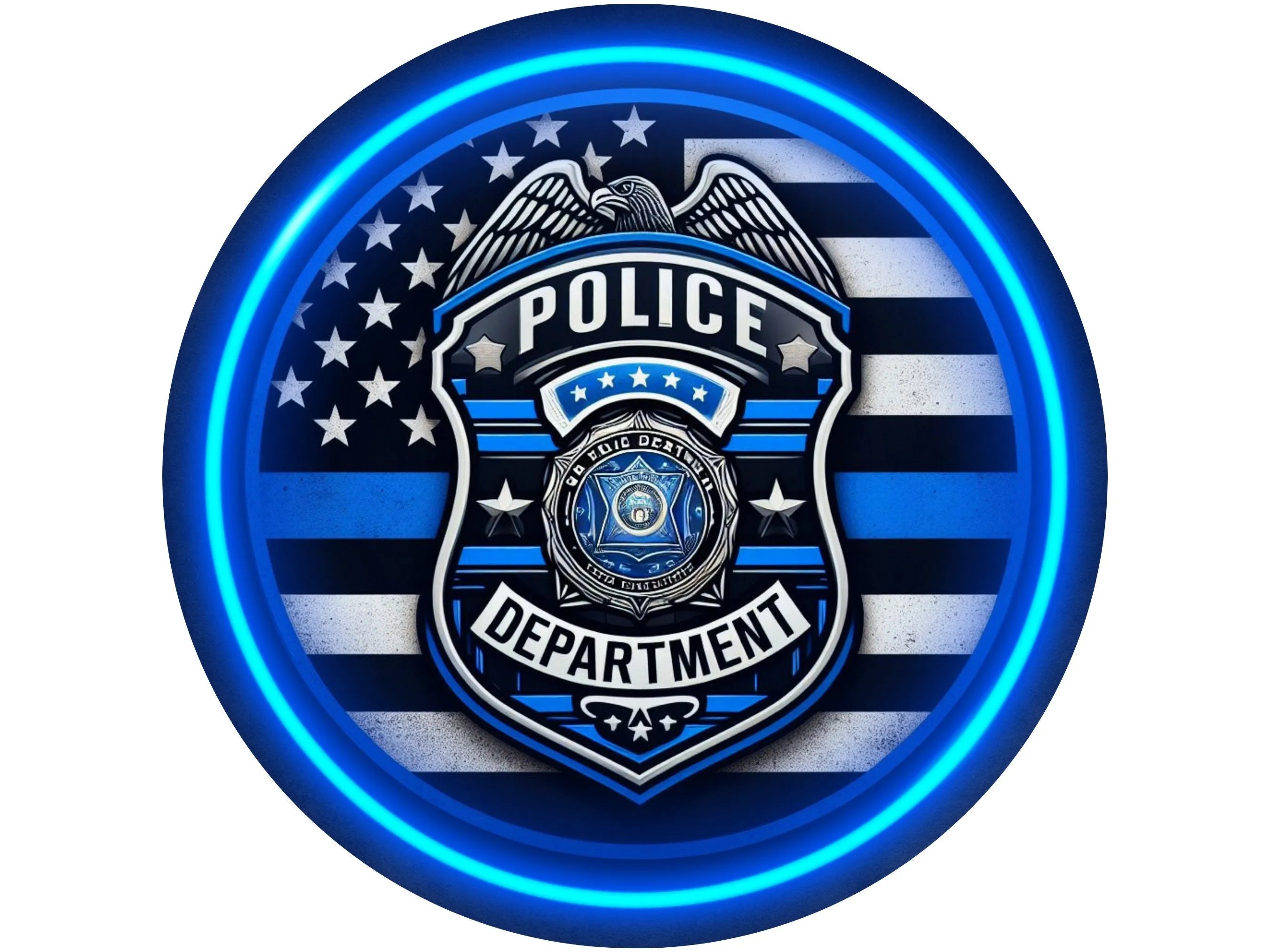 Cartel de corona de metal con el logo de la policía azul, letrero para el departamento de policía, insignia de policía y arte de pared con la bandera de la policía.