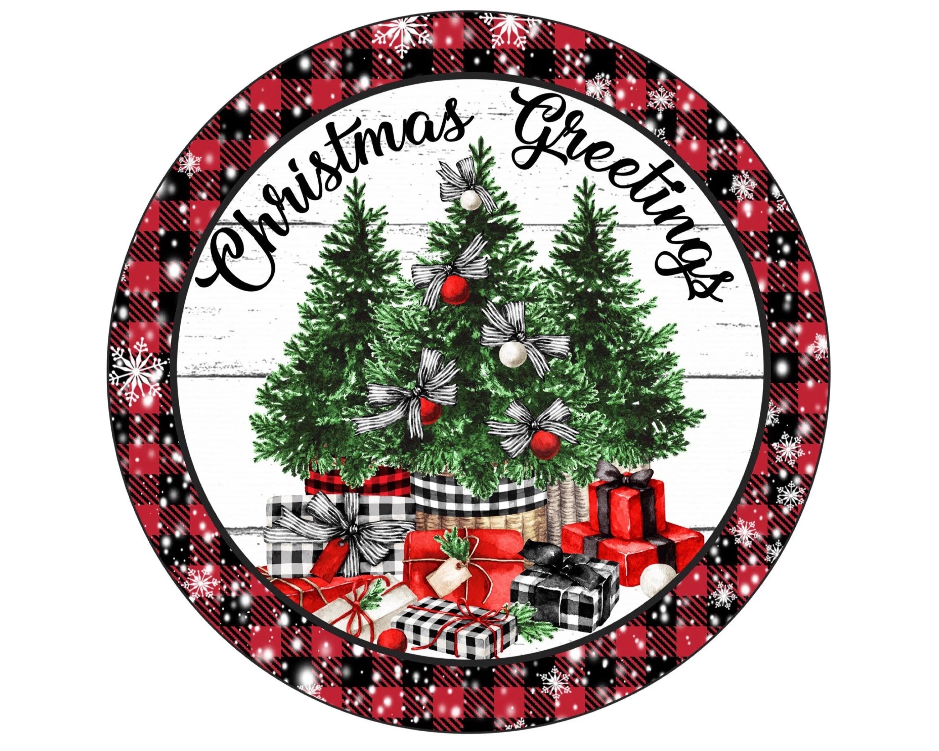 Letrero de metal con corona de Navidad con árboles de Navidad y regalos, decoración de invierno con cuadros de búfalo, arte de pared navideño vintage