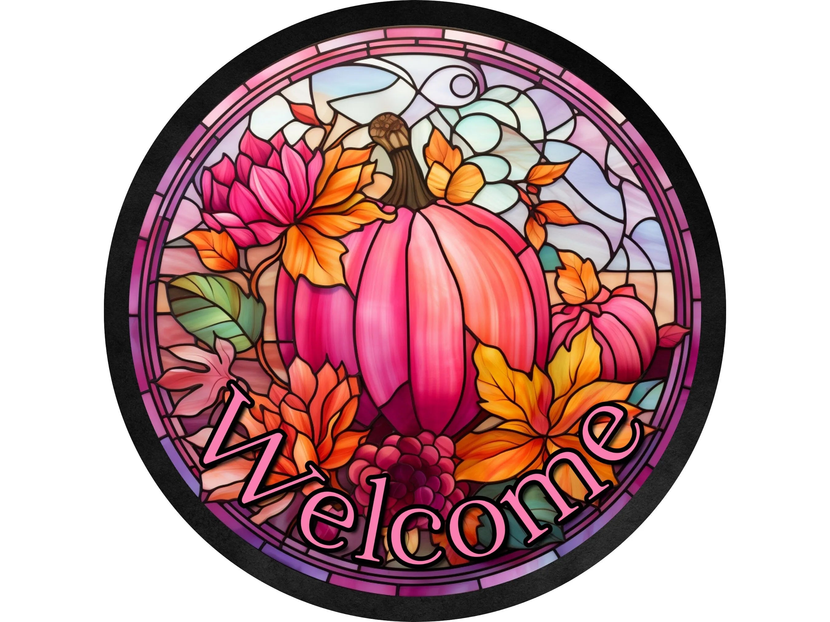 Letrero de bienvenida con calabaza de vitral falso, decoración otoñal rosa, arte mural otoñal de metal, letrero otoñal para puerta con ventana de iglesia falsa