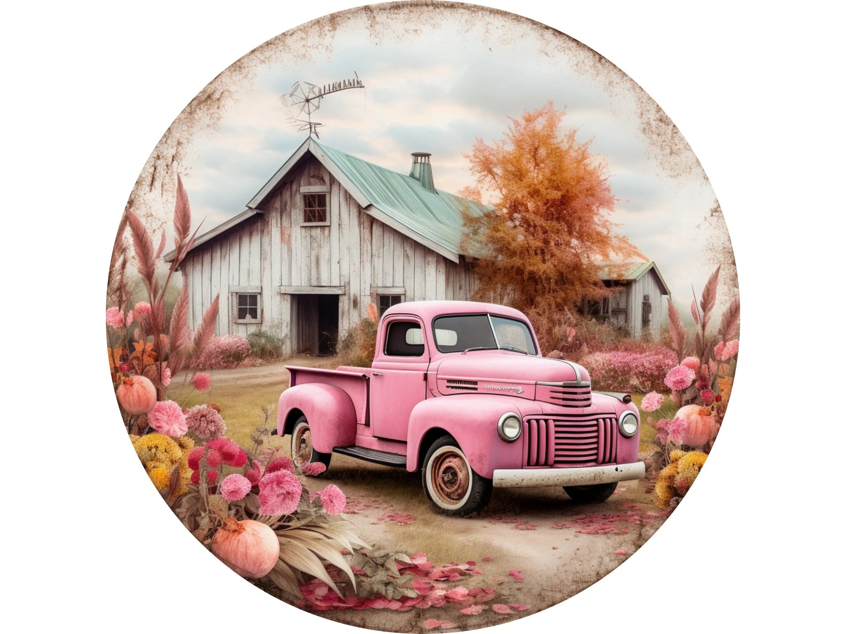 Letrero de otoño de camión antiguo rosa, decoración de granero de metal, arte rústico de pared otoñal, letrero vintage de cosecha campestre