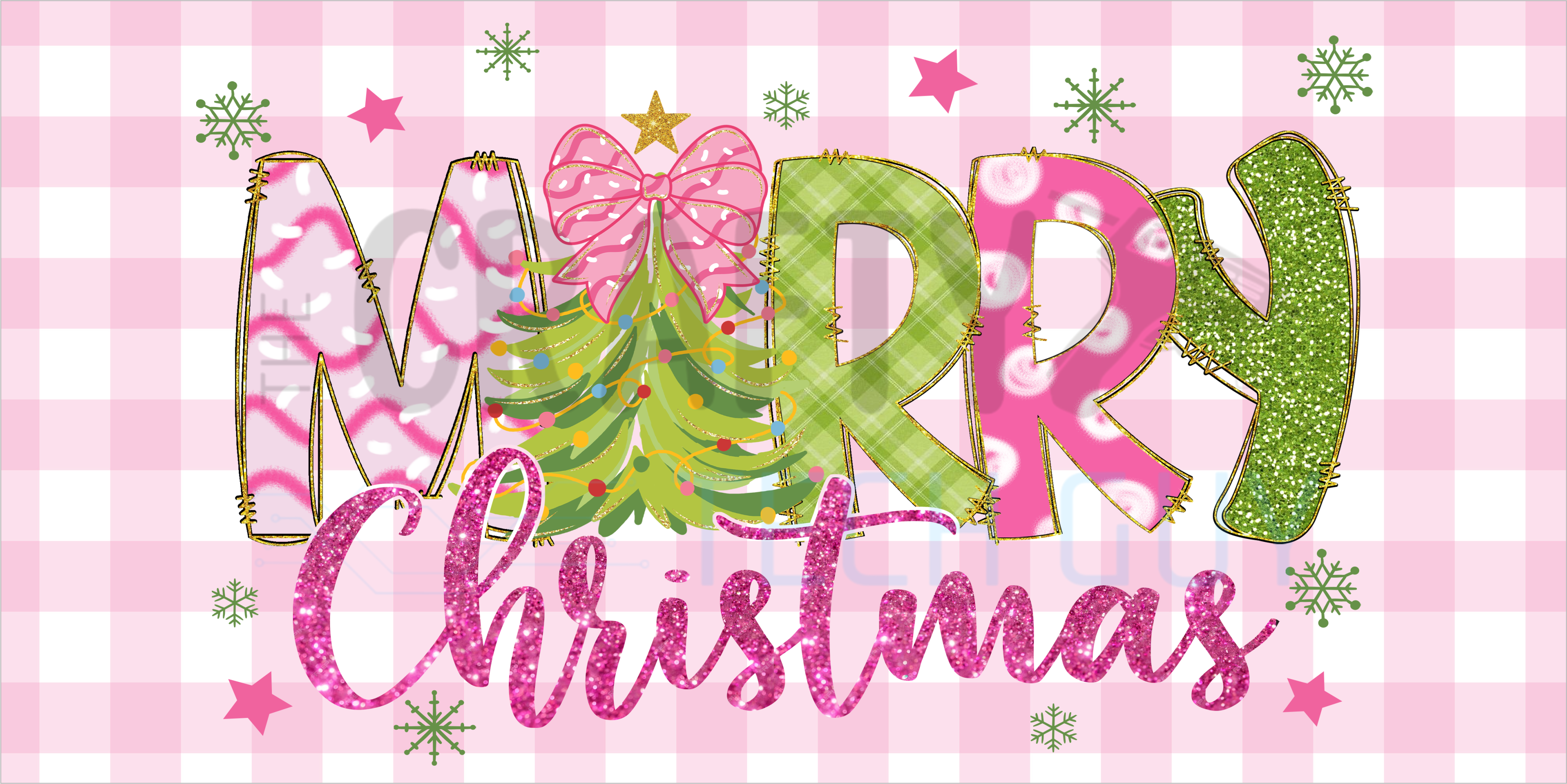 Dale un toque de encanto y alegría a tu colección navideña con este adorable letrero navideño de cuadros vichy rosas. Con una alegre combinación de estampados y texturas brillantes que forman la palabra "MERRY", un árbol de Navidad decorado en lugar de la "E" y la palabra "Christmas" en letras rosas brillantes, este diseño es perfecto para coronas navideñas femeninas, decoración estilo boutique o temáticas navideñas en tonos rosas. Copos de nieve, estrellas y adorables detalles bordados hacen de este letrero una auténtica alegría navideña.