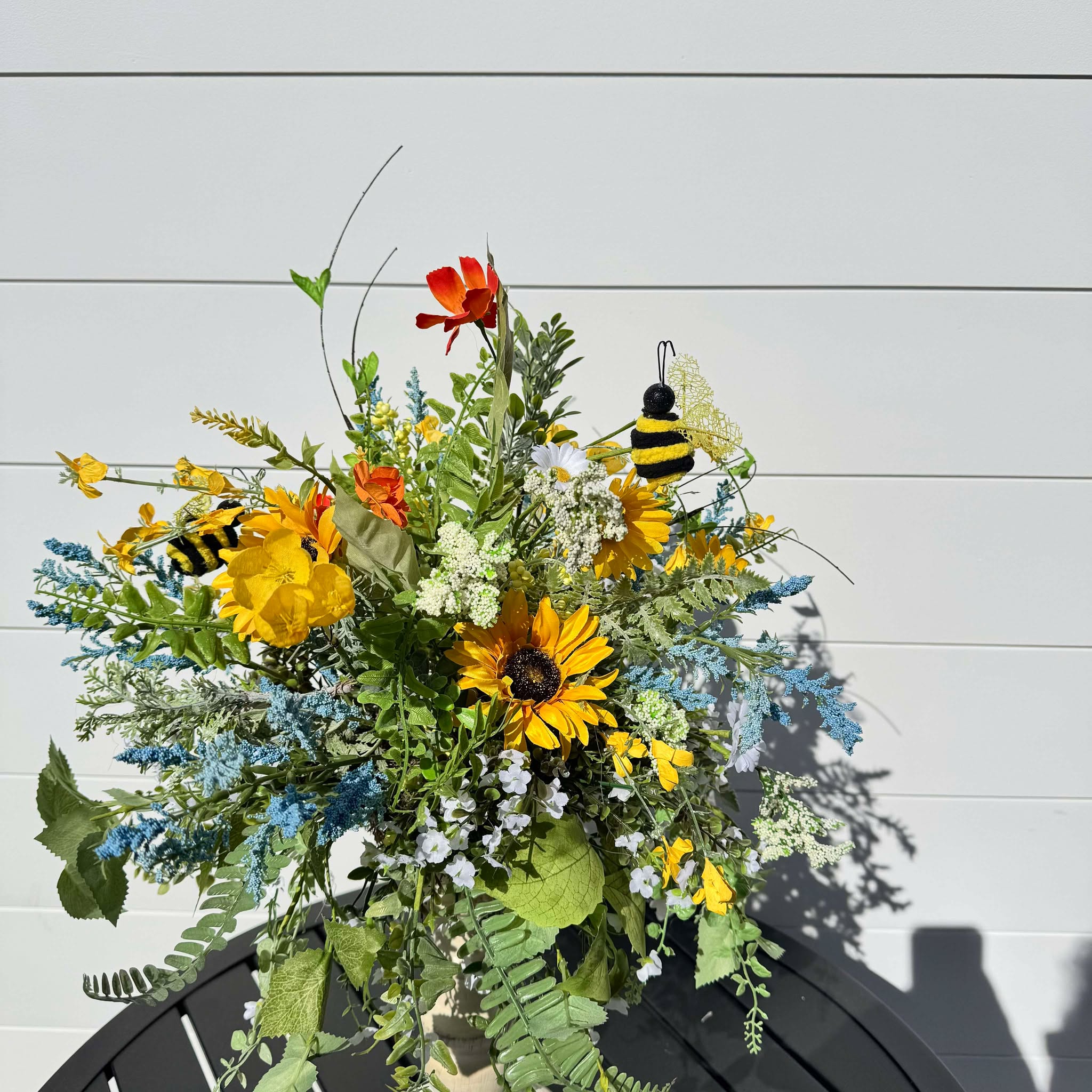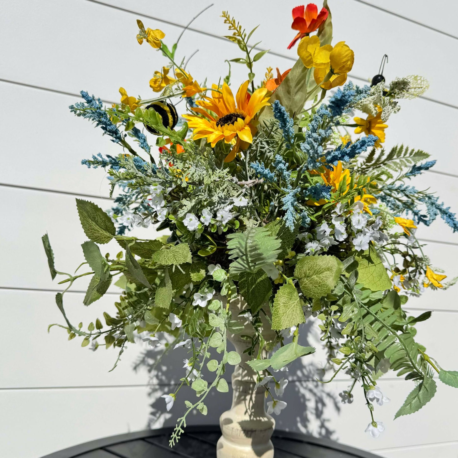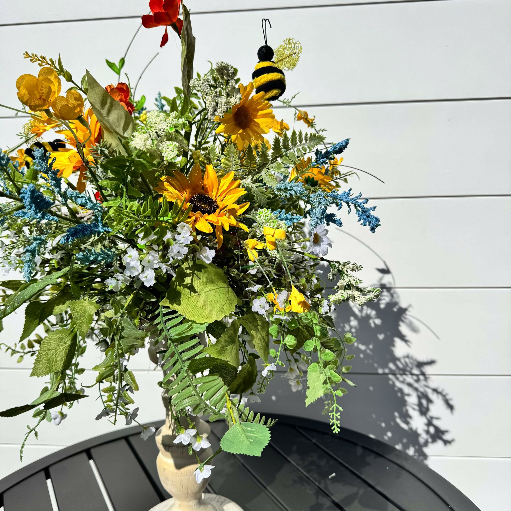 Ilumina tu espacio con este arreglo floral artesanal de girasoles y flores silvestres , con exuberante vegetación, delicadas flores blancas y vibrantes toques de amarillo, rojo y azul. Diseñado sobre un pedestal rústico de madera, este centro de mesa floral de estilo rústico es perfecto para la decoración del hogar, bodas, mesas de comedor y repisas de chimenea en primavera y verano . Adornado con encantadores detalles de abejorros , este arreglo lleva la belleza de la naturaleza al interior, ¡sin necesidad de riego!