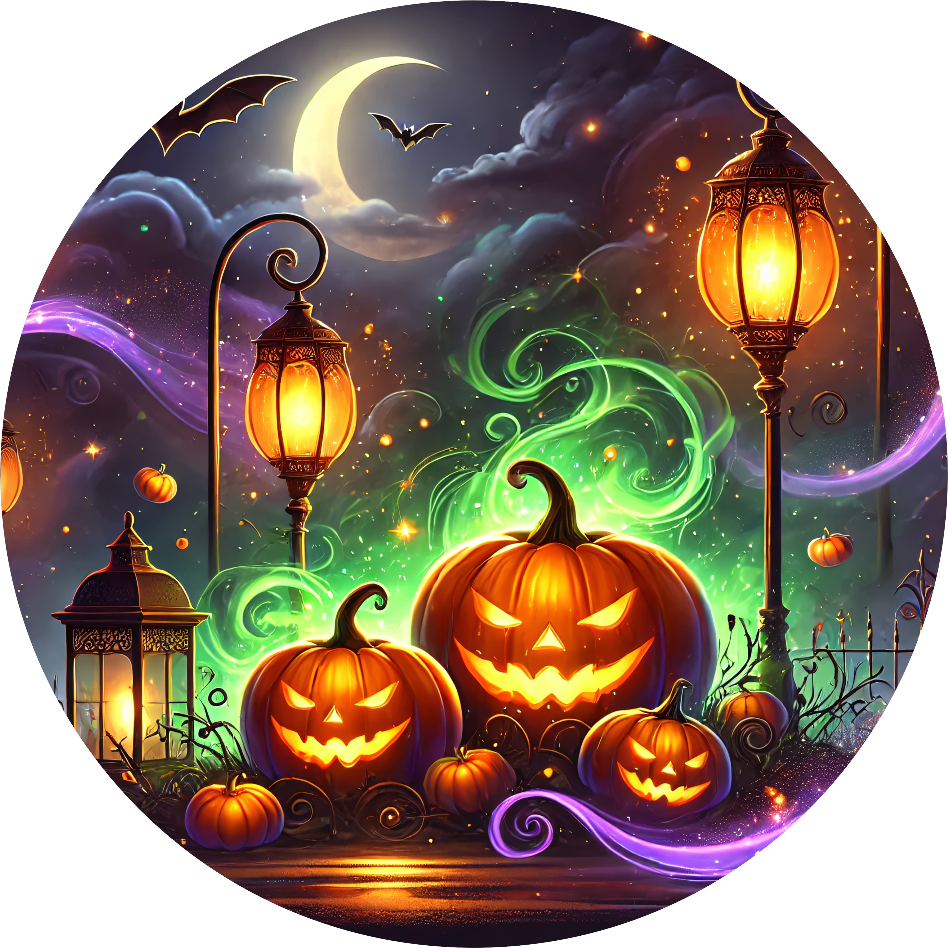 Ilumina tu decoración de Halloween con este espeluznante letrero de Jack-O-Lantern que presenta calabazas brillantes, una misteriosa niebla verde, linternas góticas y magia púrpura que gira bajo una luna creciente.