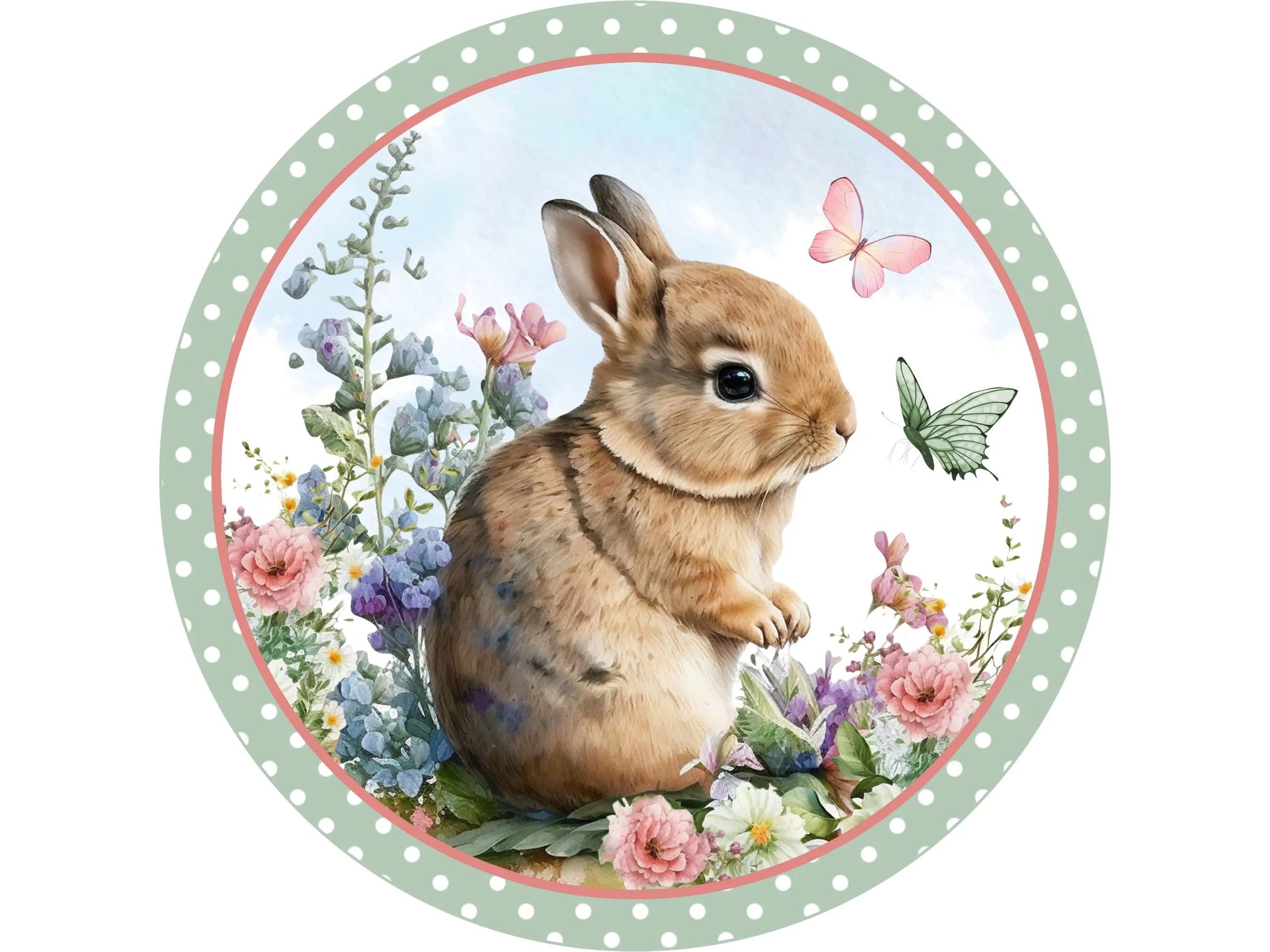 Letrero de corona metálica floral con diseño de conejito marrón y lunares blancos, arte de pared con mariposas y flores silvestres de primavera