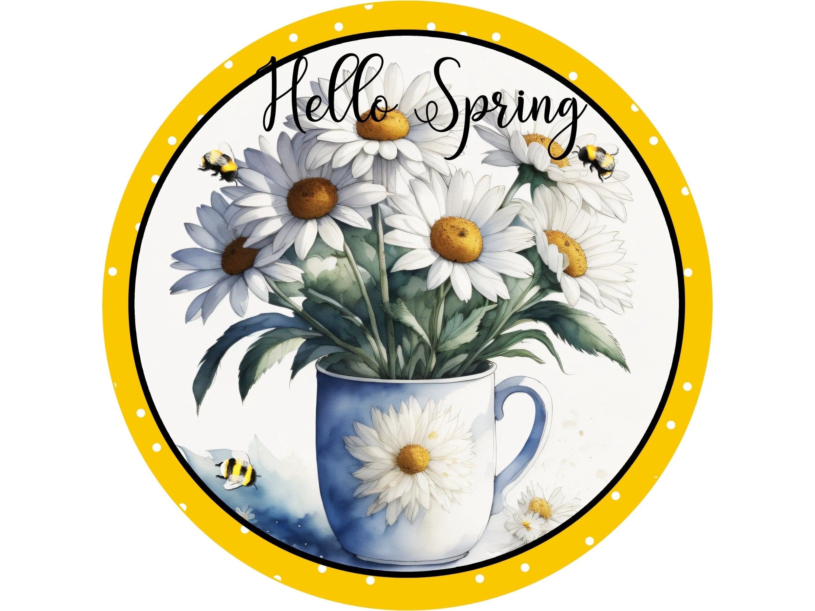 Letrero de corona de margaritas con abejas y lunares amarillos y blancos, margaritas de granja en arte de pared para taza de café, margaritas en taza de té con accesorio de corona de abejas