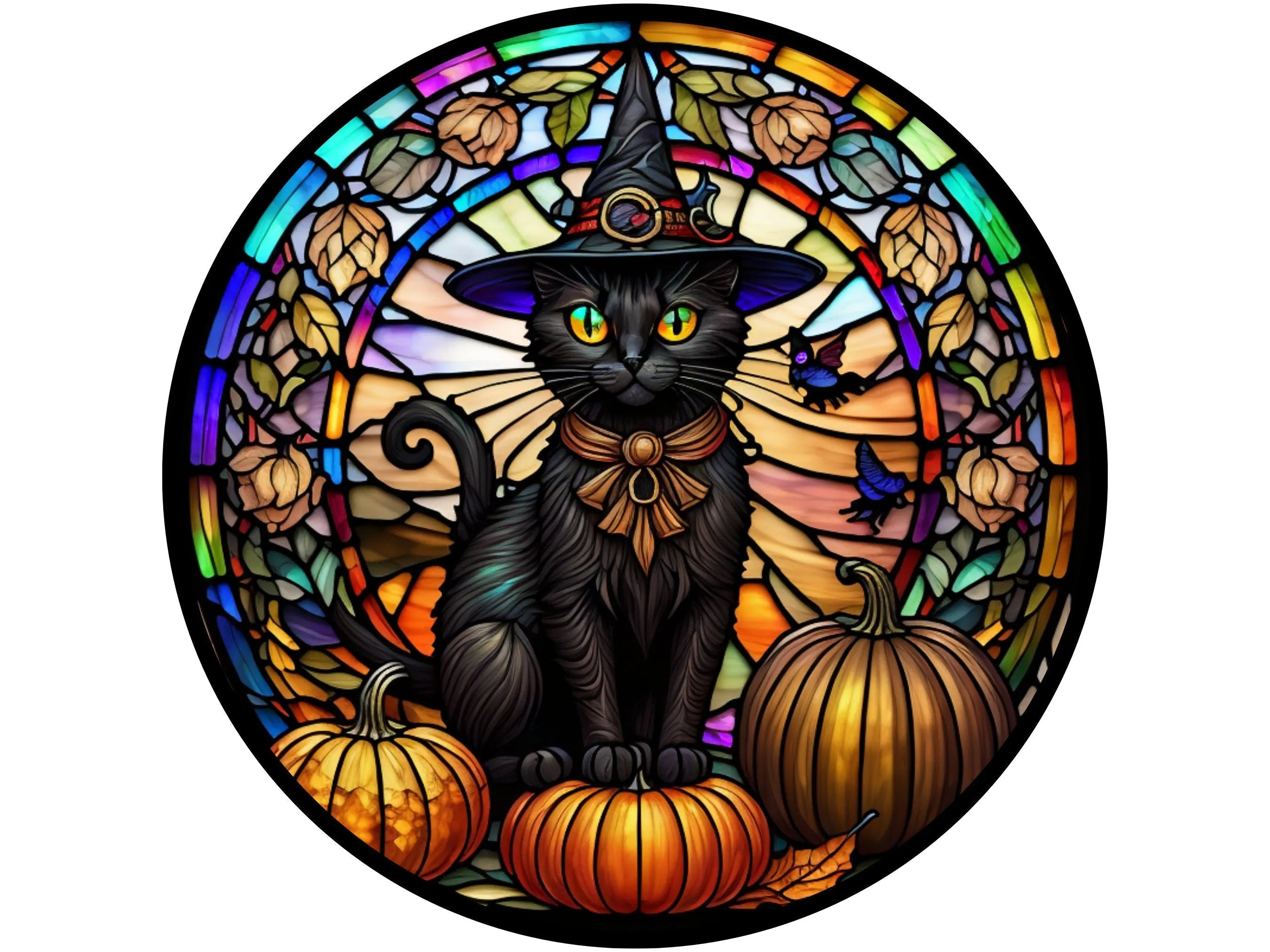 floral stained glass black cat pumpkin Halloween wreath sign, creepy cat church window October 31 sign for front door