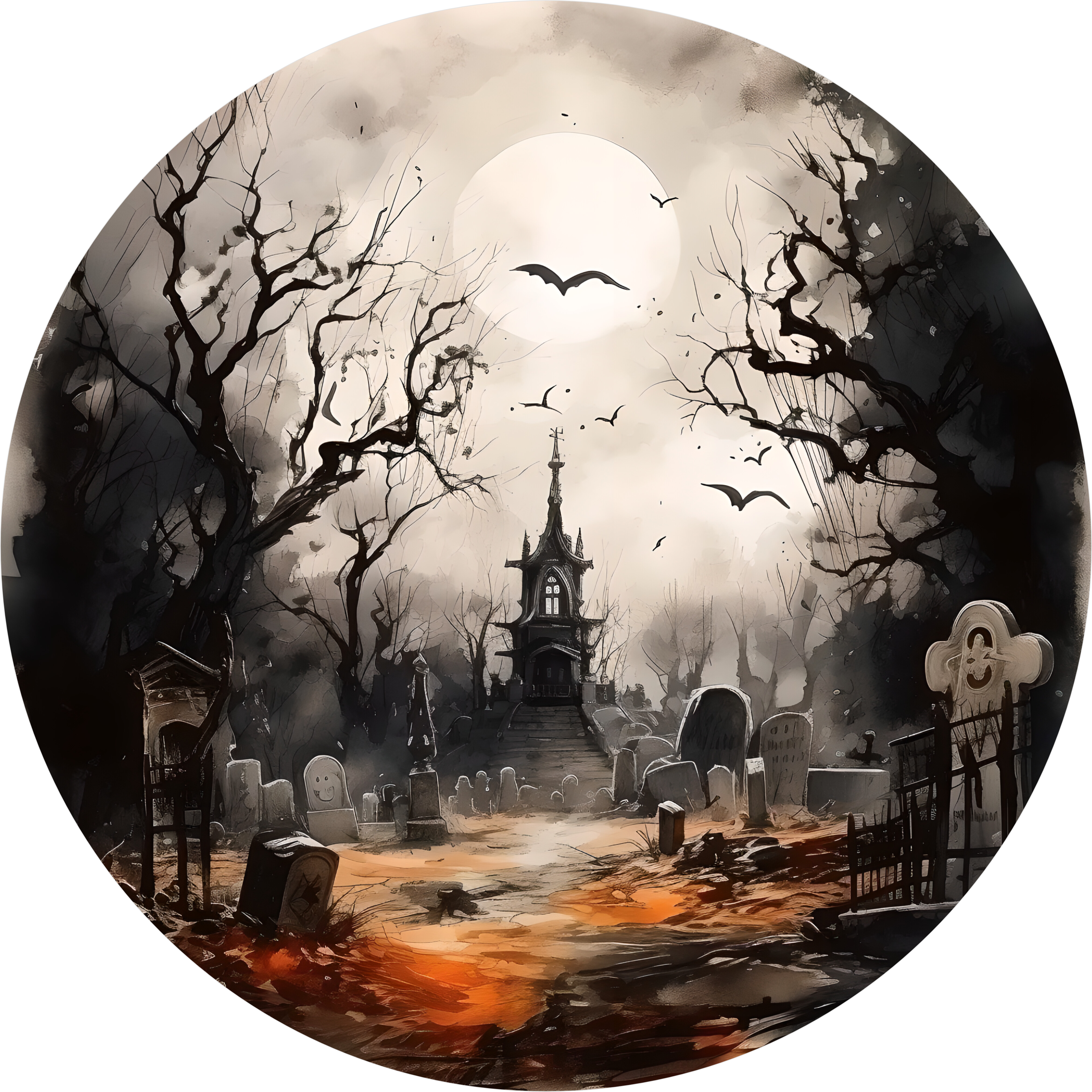 Haunted Graveyard Halloween Sign, Spooky Gothic Wreath Sign, Cemetery Full Moon Metal Sign