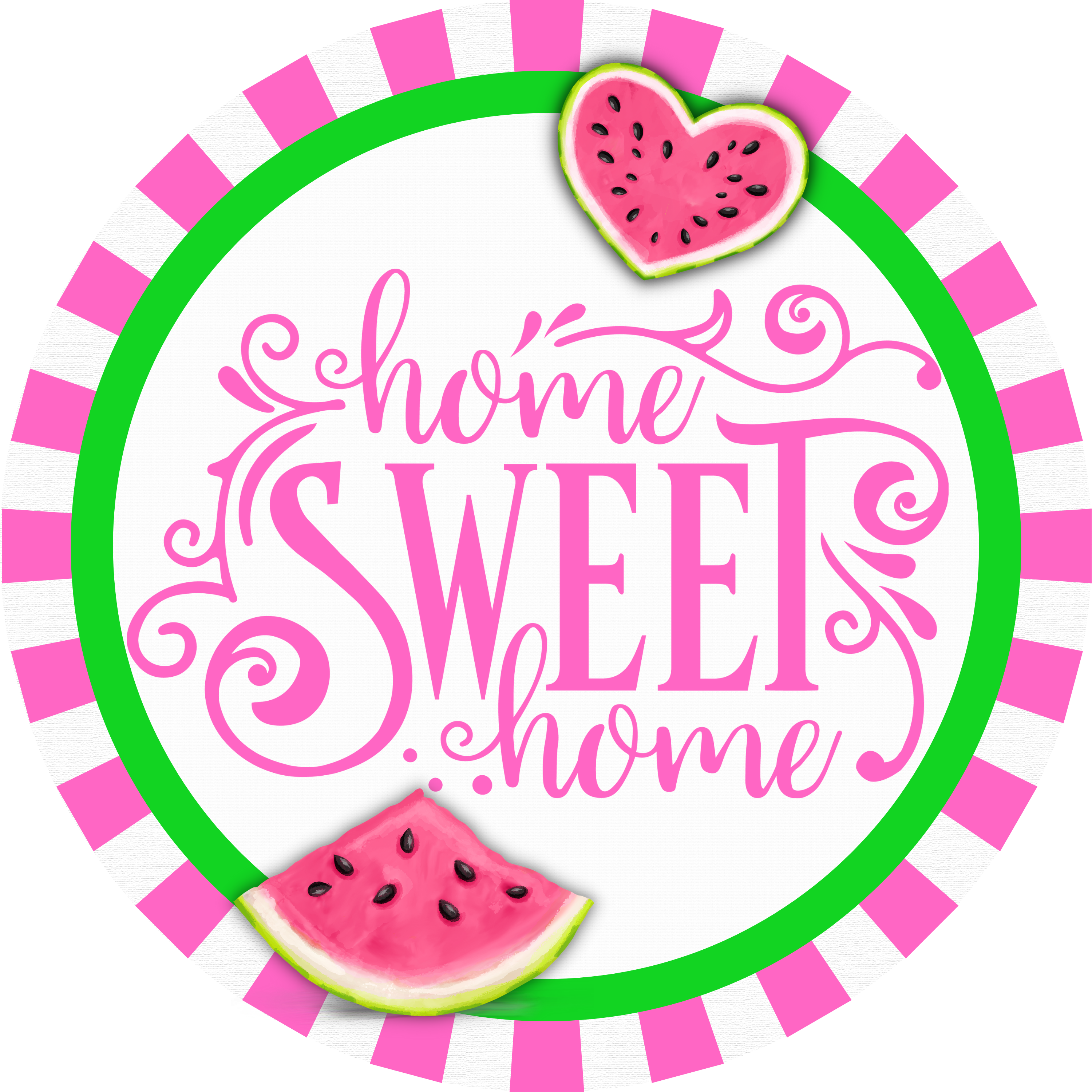 Brighten your front door with this cheerful Home Sweet Home sublimated metal sign! Featuring playful pink typography, striped border, and juicy watermelon slices (including a heart-shaped one!), this sign adds a sweet summer touch to any wreath or wall.