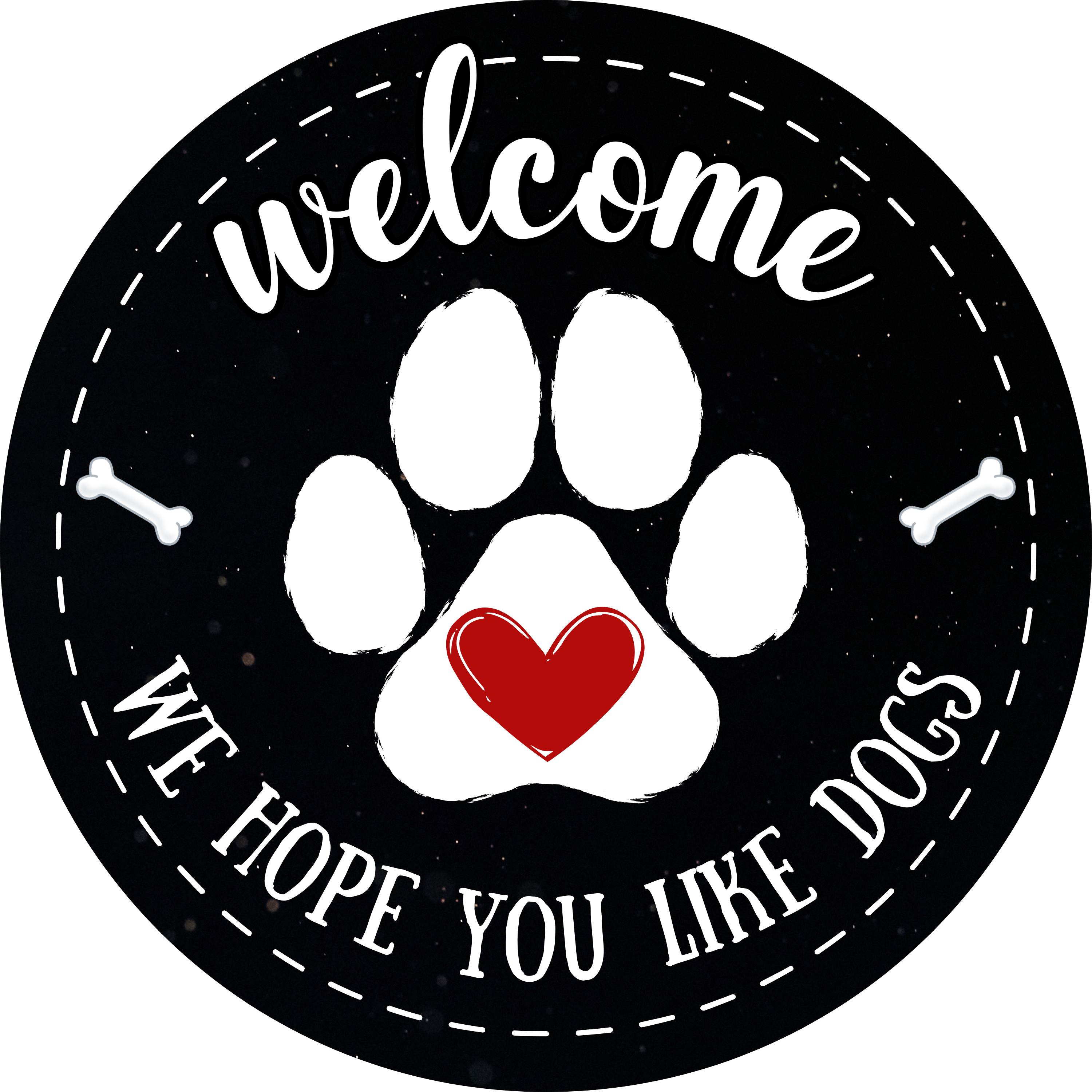 Let your guests know exactly who runs the house with this bold and heartwarming “Welcome – We Hope You Like Dogs” metal sign! Featuring a large white paw print with a red heart center on a sleek black background, this sign is a must-have for dog lovers who want to add playful charm to their front door, porch, entryway, or dog-themed wreaths.