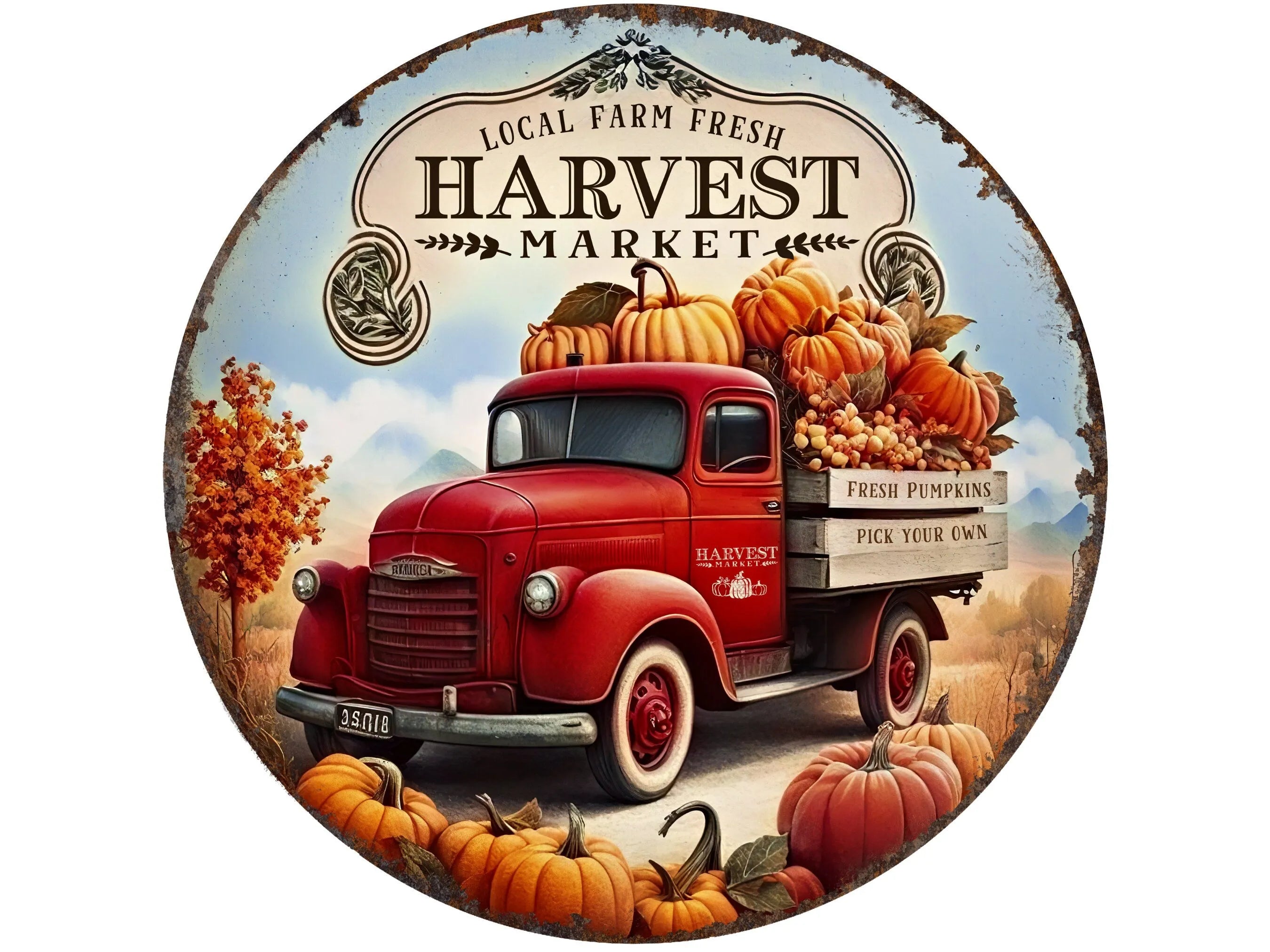 Local Farm Fresh Harvest Market Sign, Red Truck Pumpkin Decor, Rustic Fall Metal Wall Art, Autumn Market Sign