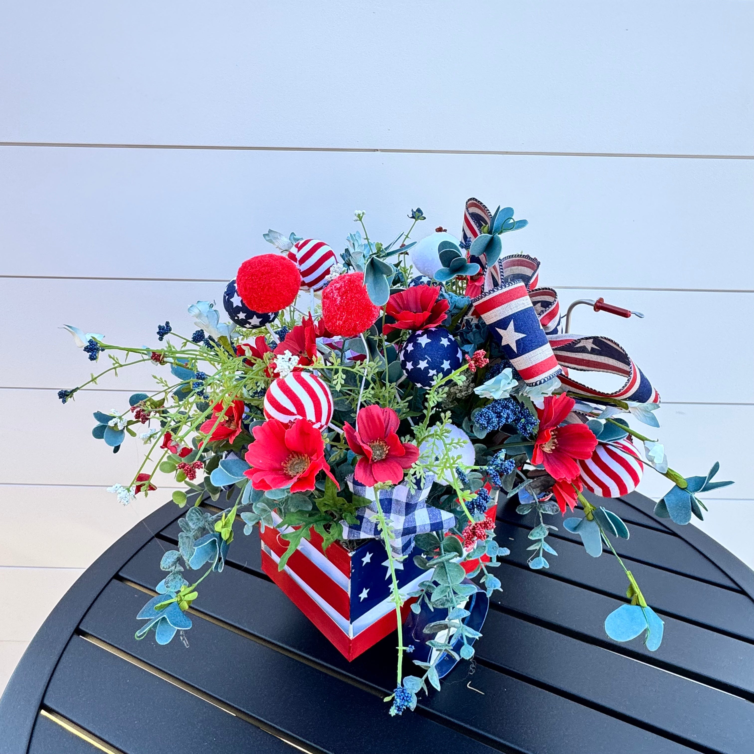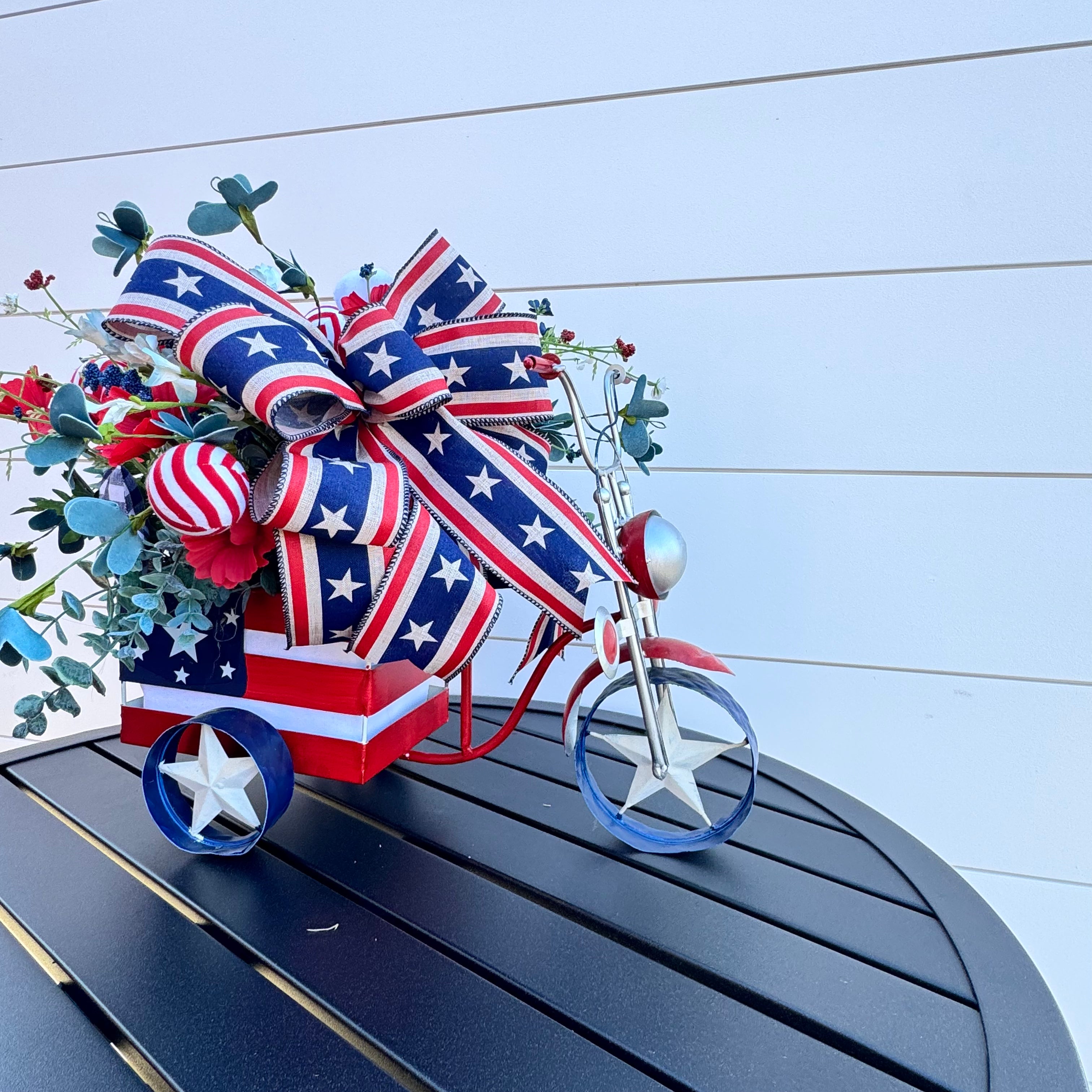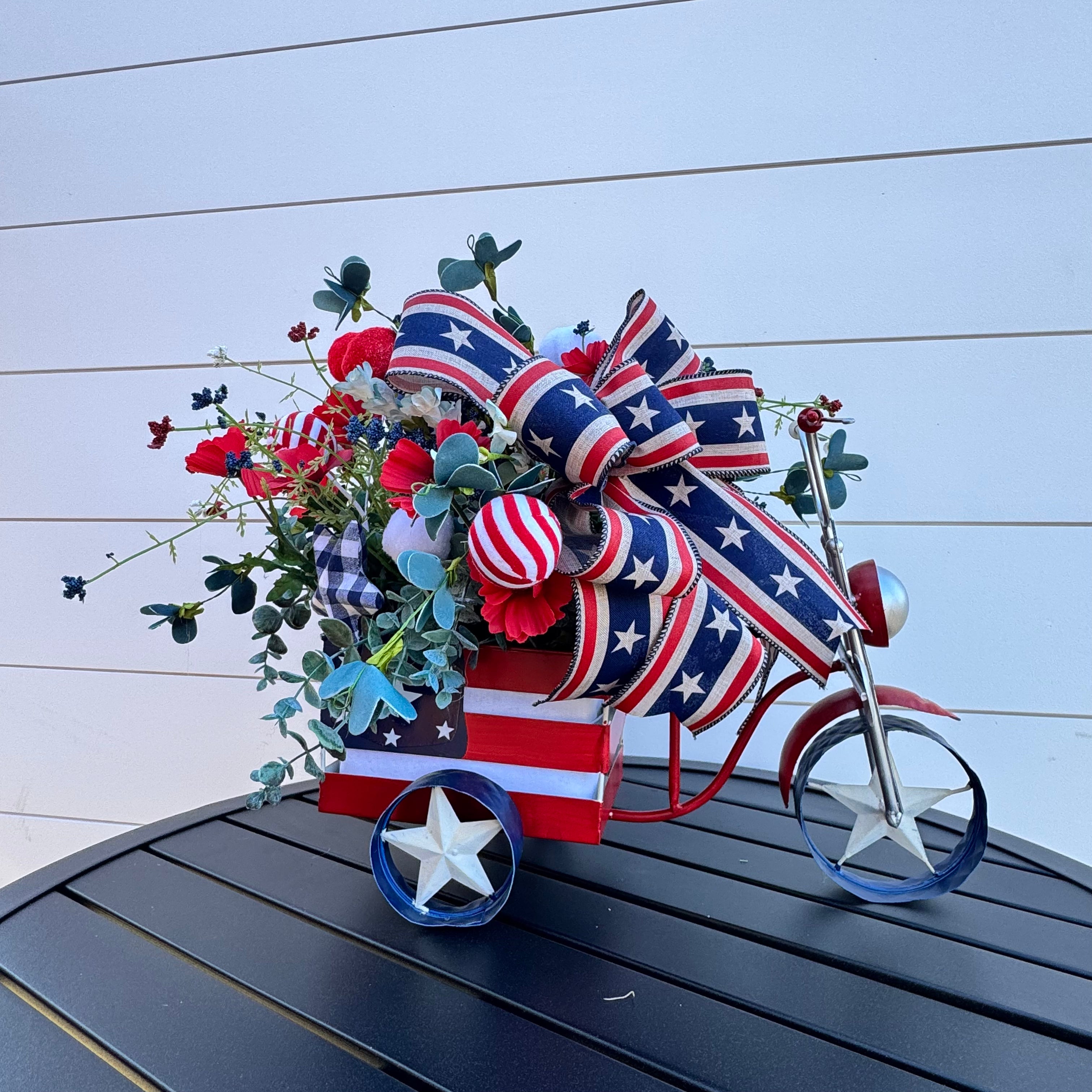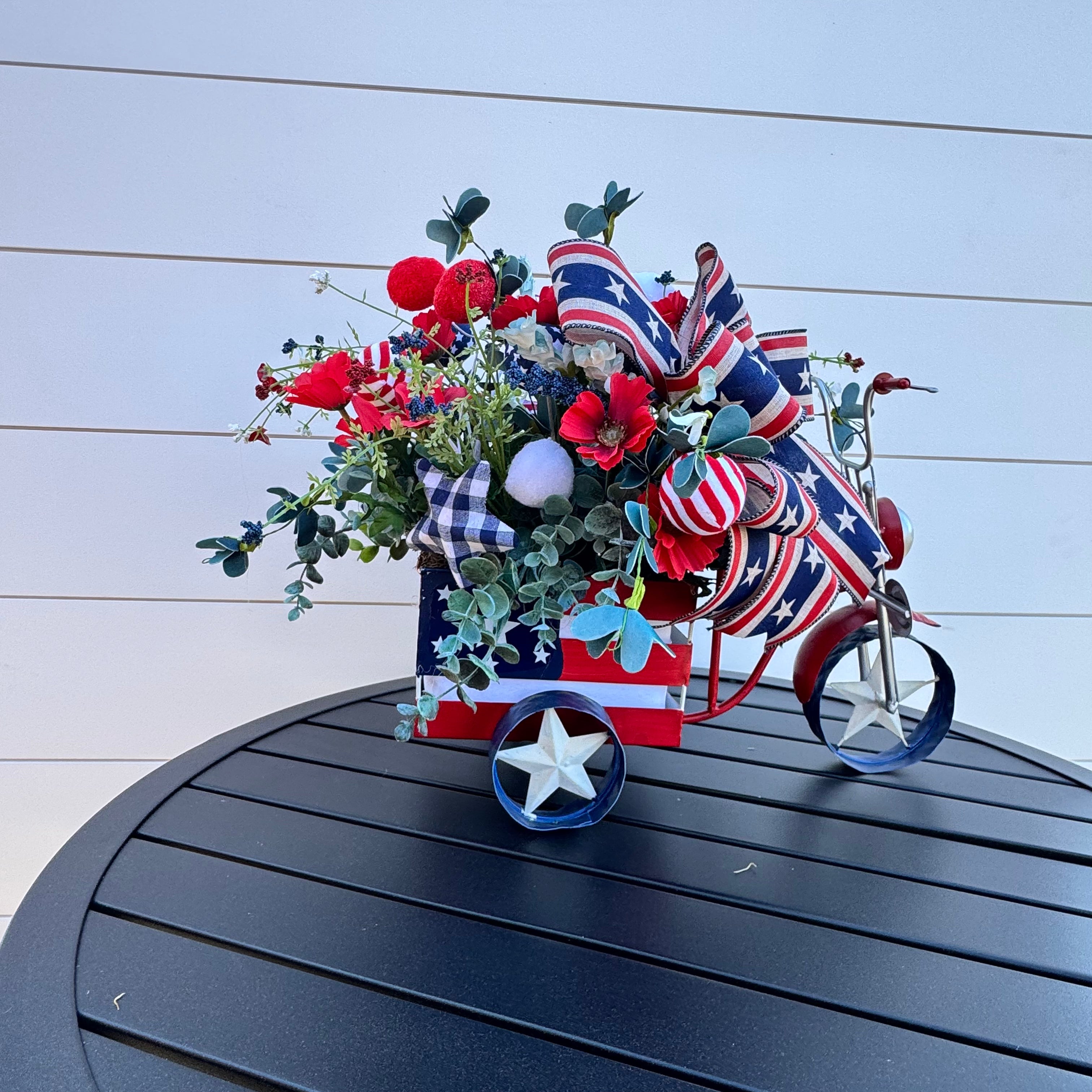 Celebrate American pride and vintage charm with this handcrafted patriotic floral arrangement, beautifully displayed in a metal tricycle planter with star accents. Featuring red, white, and blue florals, lush greenery, gingham details, and bold patriotic ribbon, this eye-catching centerpiece is perfect for Independence Day, Memorial Day, and Americana home decor. Whether placed on a mantel, entryway table, or porch, this festive floral display is a stunning way to show your love for the USA!
