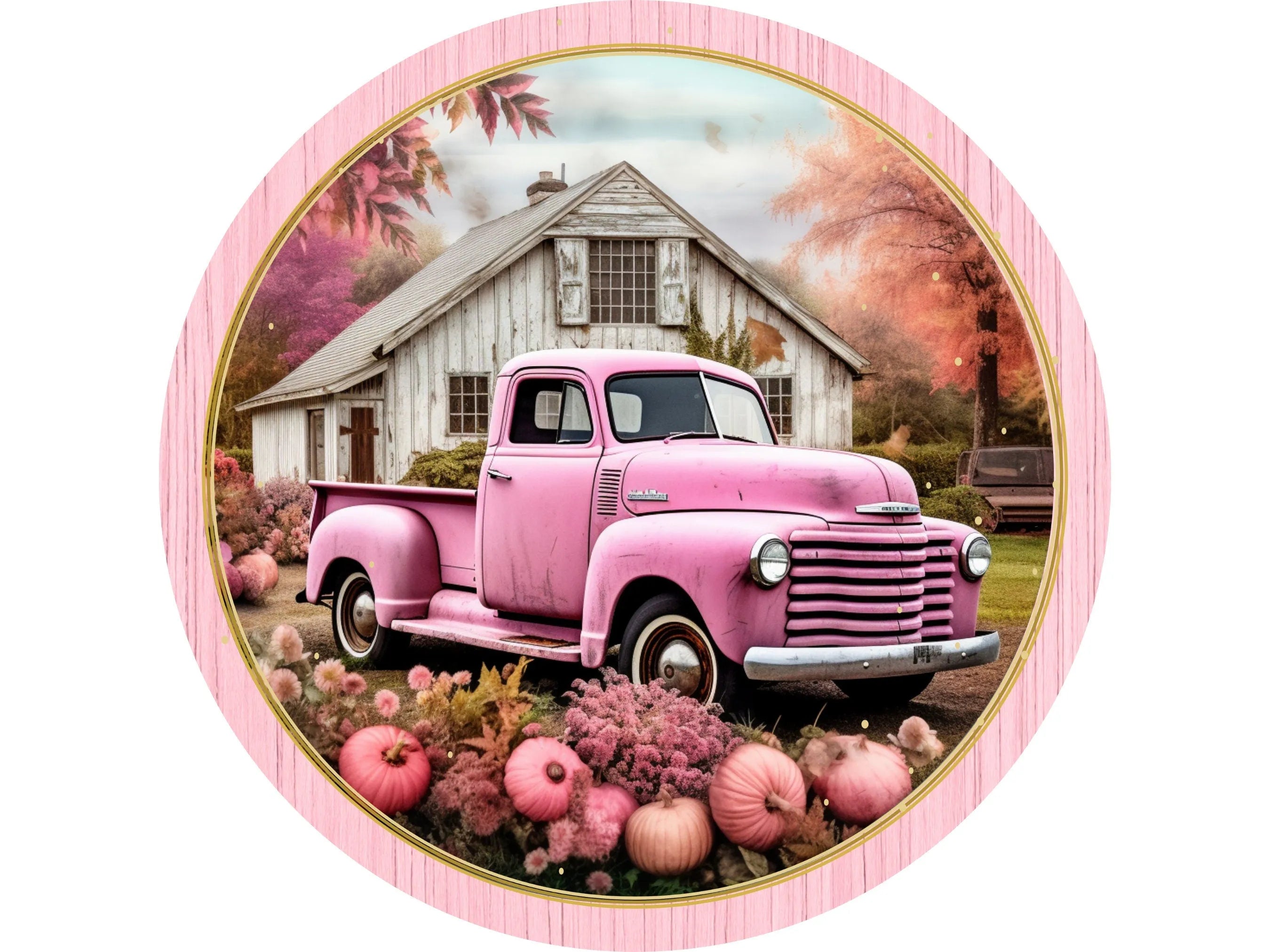 Pink Truck with Pumpkins Sign, Metal Farmhouse Fall Decor, Rustic Barn Autumn Wall Art, Vintage Harvest Sign
