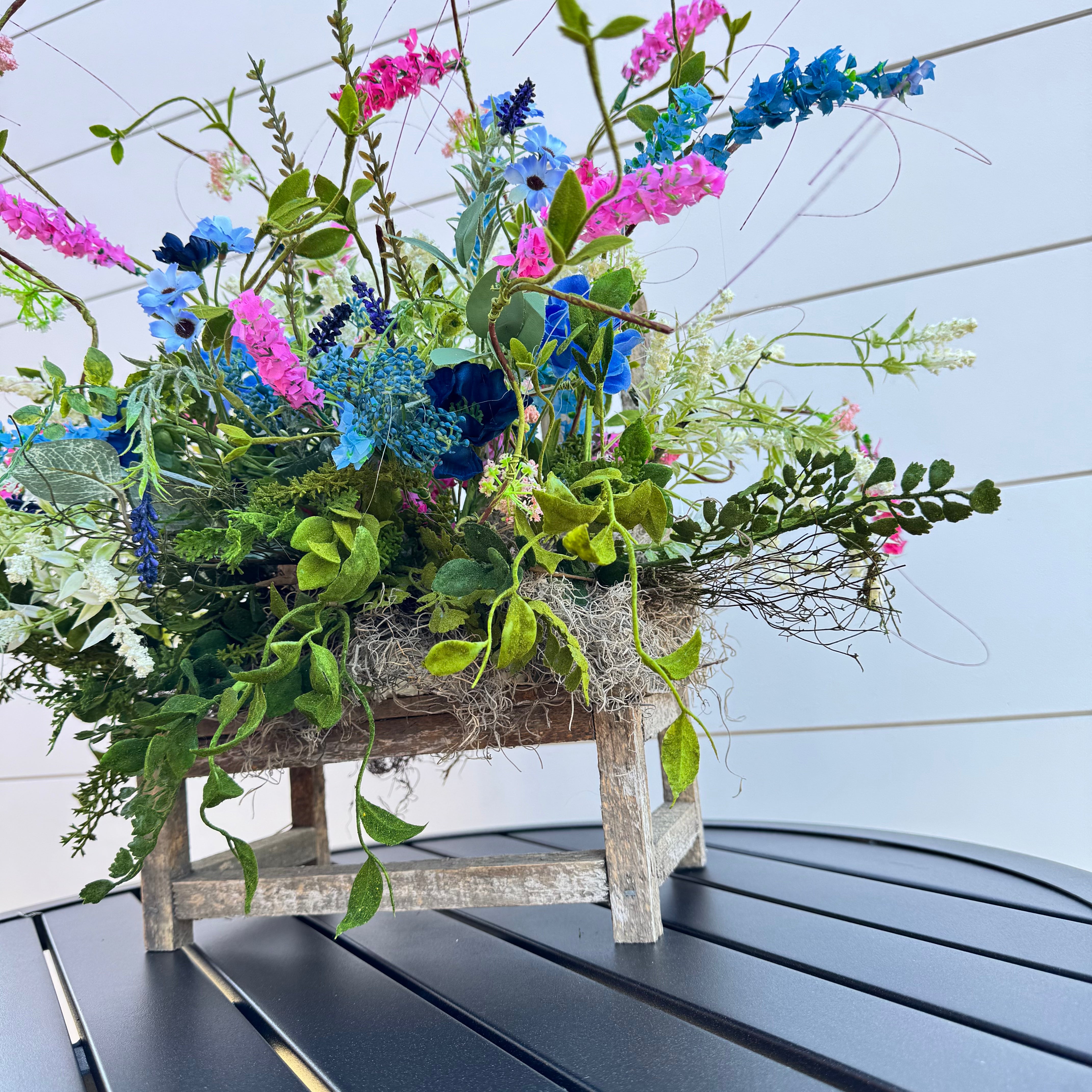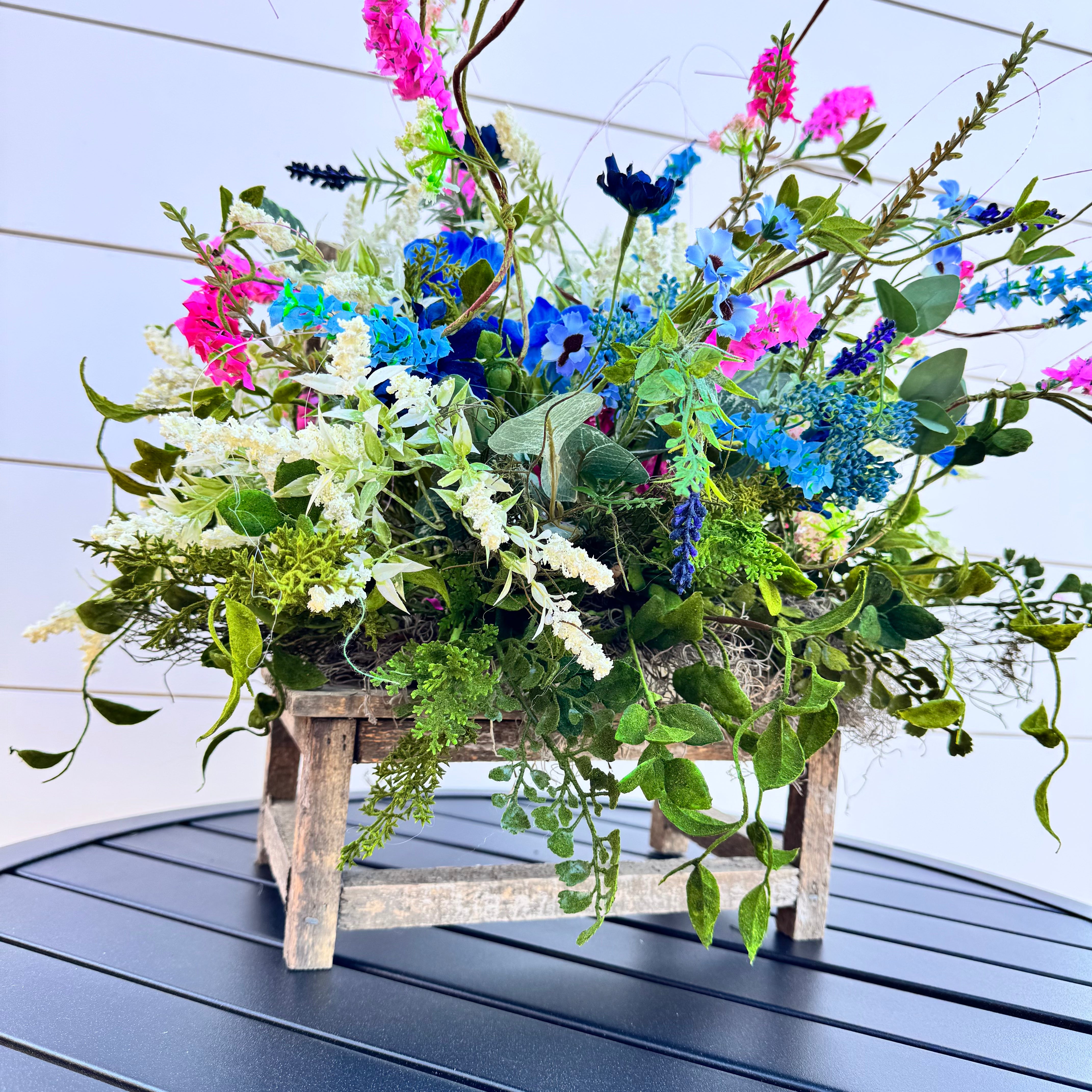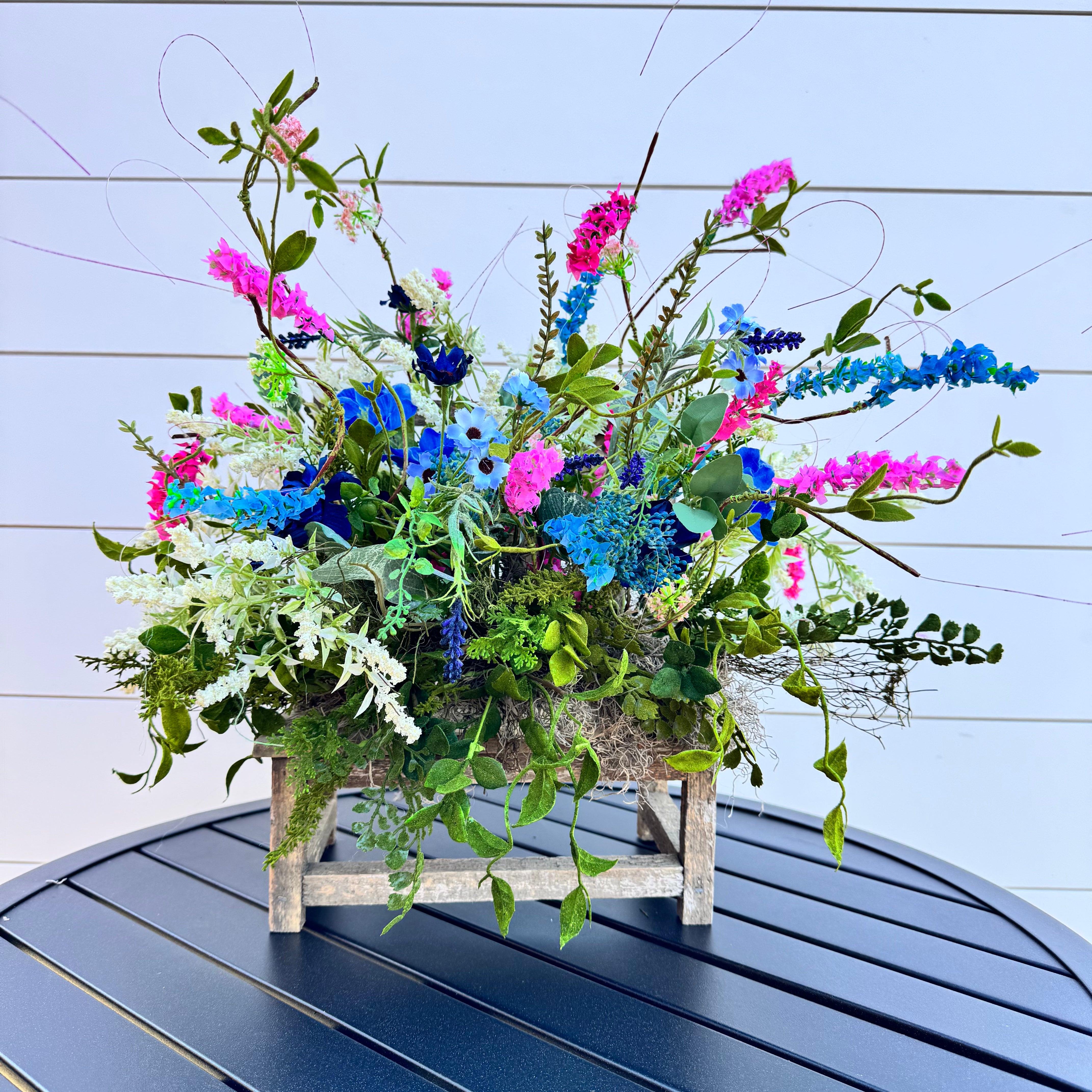 Rustic Wildflower Arrangement – Handmade Blue & Pink Floral Centerpiece, Farmhouse Wooden Box Spring & Summer Home Decor