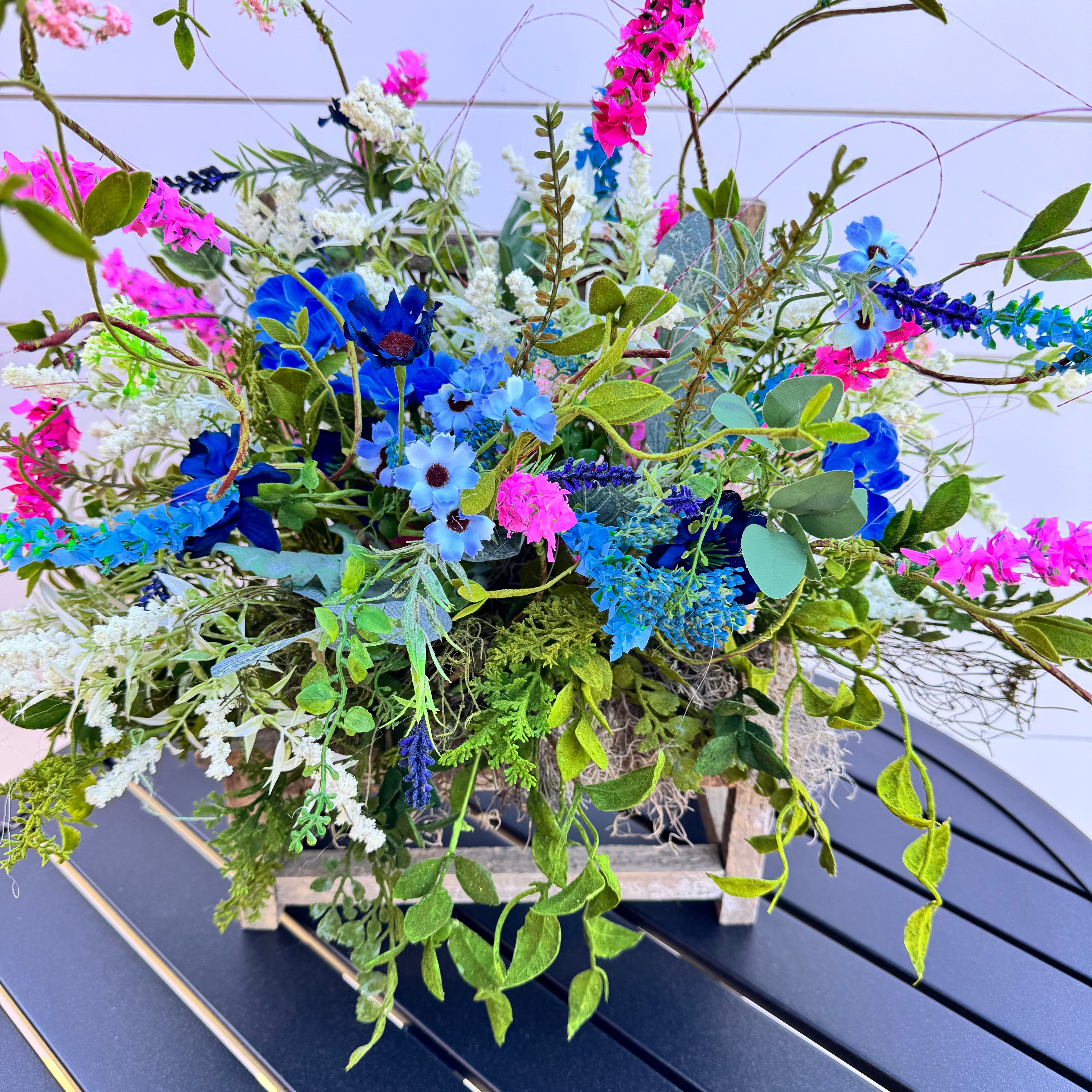 Bring the beauty of a wildflower meadow indoors with this handcrafted rustic floral arrangement, designed in a farmhouse-style wooden box. Featuring a lush mix of blue, pink, and white wildflowers, paired with delicate greenery and natural moss, this stunning spring and summer centerpiece adds a touch of elegance to any space. Perfect for entryways, dining tables, mantels, and weddings, this versatile faux floral design requires no maintenance while staying fresh year-round.