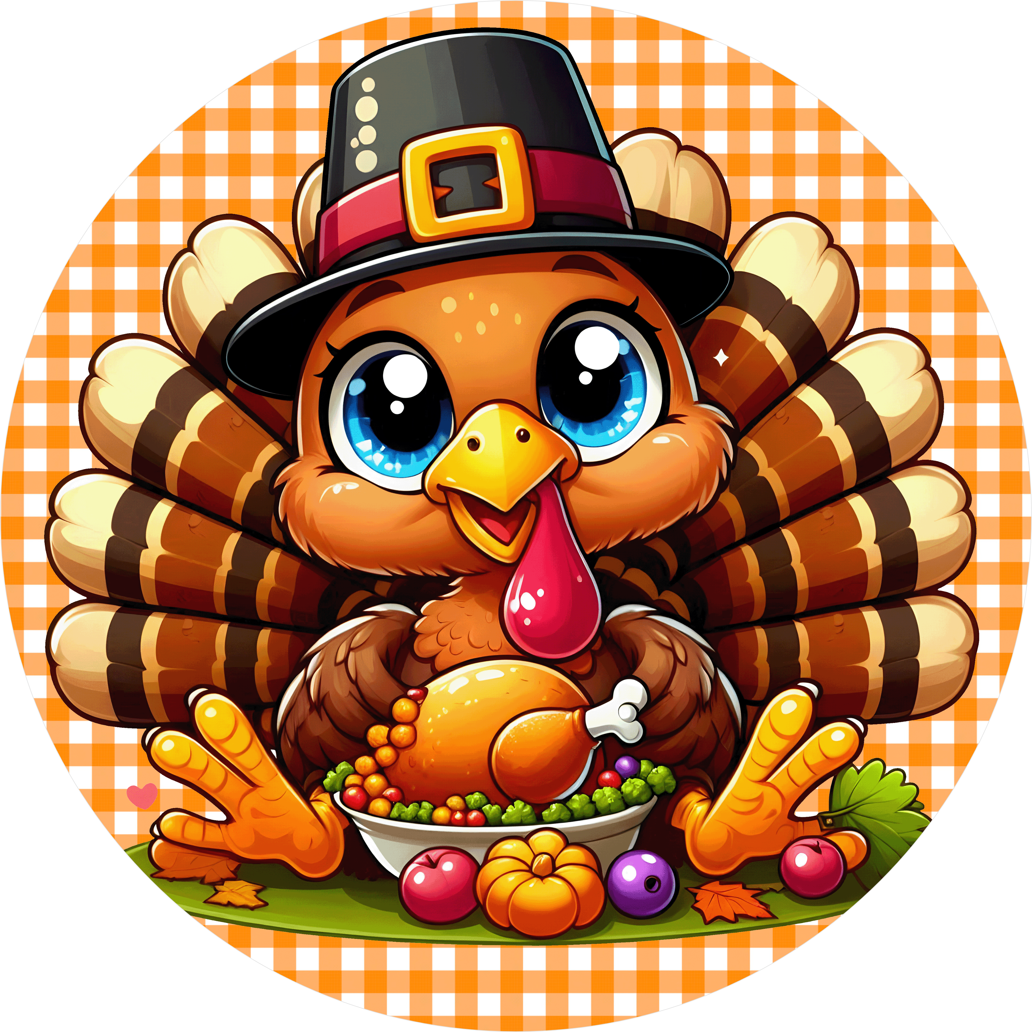 This charming Thanksgiving sign features a bright-eyed turkey in a pilgrim hat, proudly holding a festive feast surrounded by pumpkins and fall leaves. With its bold orange gingham background and playful design, this 12" sublimated metal sign is perfect for wreaths, kitchens, front doors, or seasonal wall decor. Its high-gloss finish and vibrant colors bring a joyful touch to your holiday decorating. Great for gift-giving or adding personality to your own fall display!