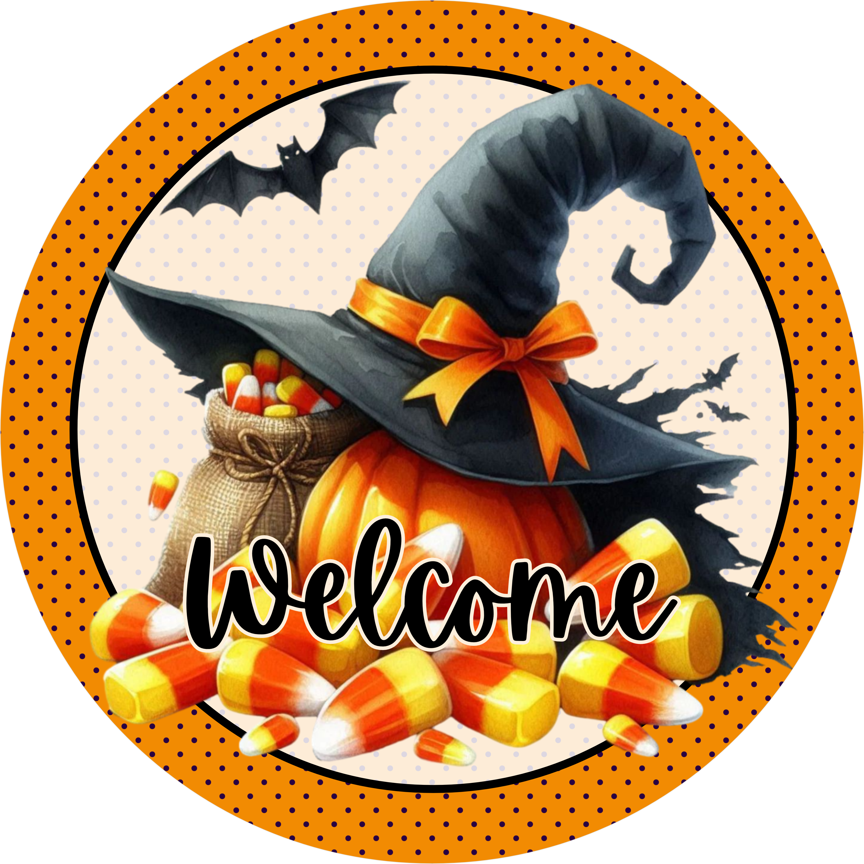 Halloween Candy Corn Welcome Sign, Witch Hat Pumpkin Metal Sign, Fall Wreath Decor, Orange Polka Dot Halloween Door Sign