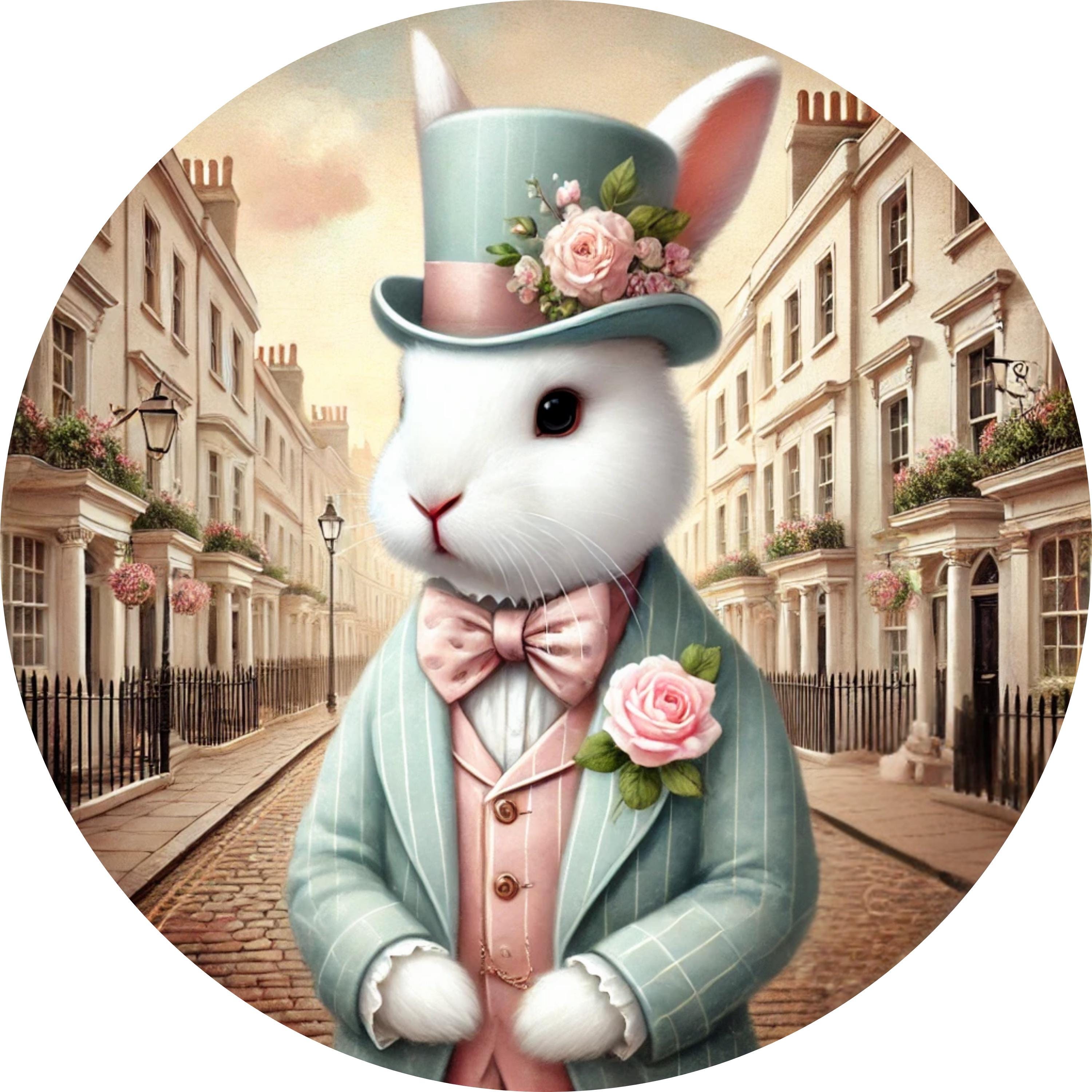 Step into a whimsical world of vintage charm with this dapper Regency-era bunny wall art! Featuring a white rabbit dressed in an elegant pastel blue coat, top hat, and pink bowtie, this Victorian-inspired portrait is the perfect blend of storybook magic and classic sophistication.